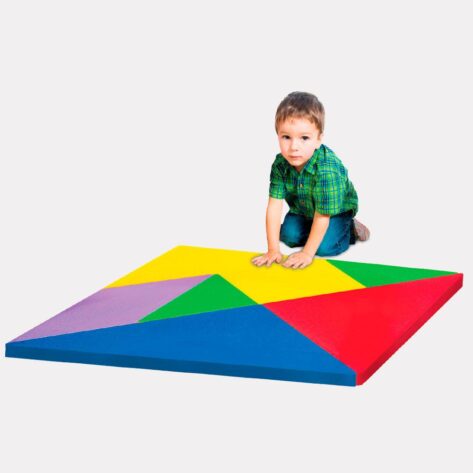 Desarrolla percepción espacial, geometría y pensamiento creativo. Material de hule espuma forrado con tela vinil de tamaño extra grande que simula una colchoneta sobre el piso.