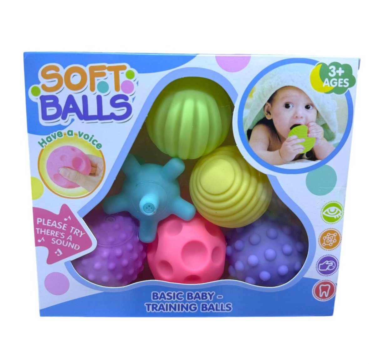Contiene 6 piezas de diferentes colores y formas, fabricadas en plástico suave y seguro para los más pequeños. Cada pelota tiene una textura única que estimula el sentido del tacto, la coordinación y la motricidad fina. Recomendadas para bebés de 3 meses en adelante, favorecen el desarrollo sensorial y visual, además de ser fáciles de agarrar con sus manitas. Perfectas para juego, exploración y estimulación temprana.